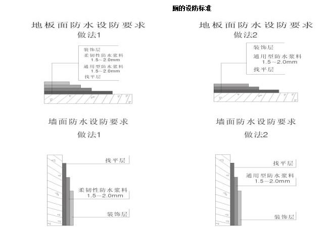 廚、浴、廁均應采用迎水面防水;地面防水層應設在結構層的找平層上面,墻體應做好防水抗滲處理,注意管口及陰陽轉角的處理,由于不受氣候影響,溫差變化不大,對材料的廷伸率要求不高,一般采用通用型防水,局部管口、陰陽角采用柔韌性加強(按剖面圖)。