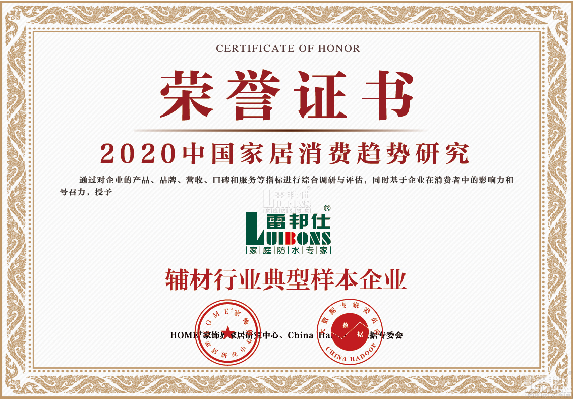 2021年1月27日,HOME家飾界、China Hadoop大數據專委會發布了2020中國家居消費趨勢研究暨行業典型樣本企業成果。雷邦仕成功入選2020中國家居消費趨勢研究輔材行業典型樣本企業,同時獲得“2020消費趨勢研究消費者喜愛的防水品牌”。