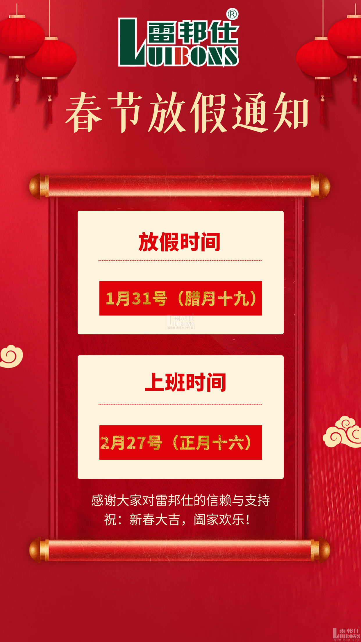 雷邦仕防水恭祝大家新年福運滿門、財源滾滾!