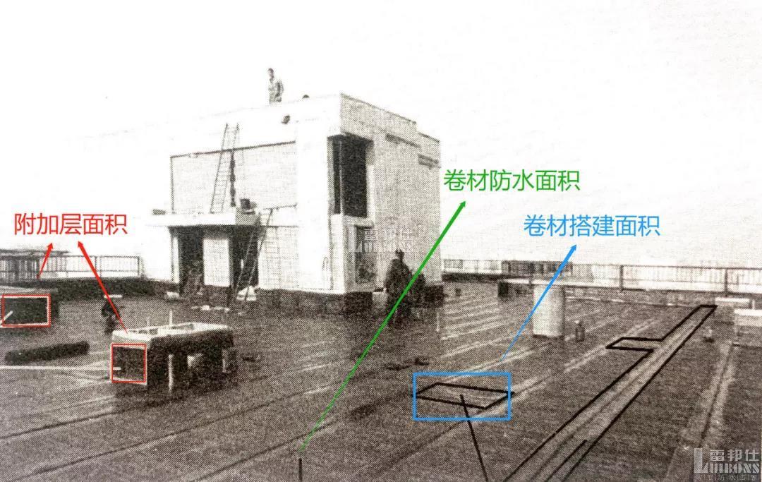卷材防水層面積按照施工圖紙計(jì)算,或從工地現(xiàn)場(chǎng)實(shí)際測(cè)量所得,如下圖所示。