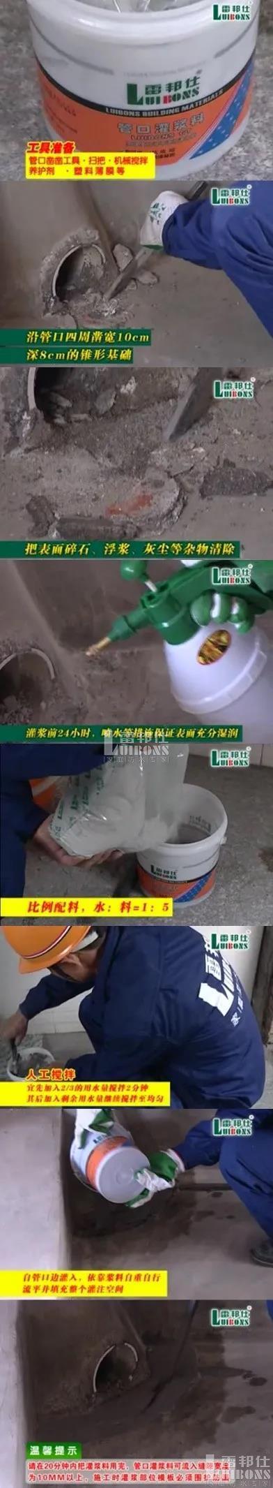 地漏關(guān)口外圍的混凝土不密實(shí)推薦使用雷邦仕管口灌漿料,防水材料推薦使用聚合物水泥防水涂料等。做防水前先使用管口灌漿料能夠更有效的預(yù)防滲漏問題。